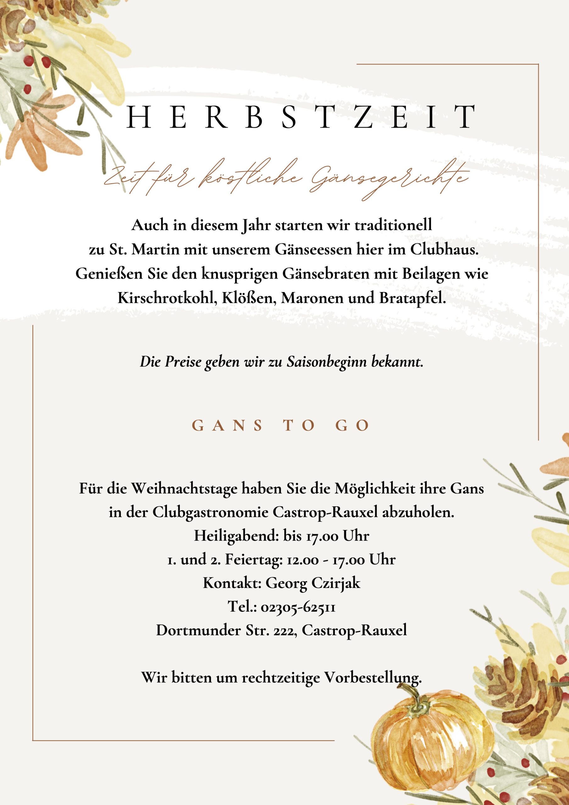 Das Martinsgans-Turnier am 8. November ist das letzte Turnier des diesjährigen Turnierkalenders und aufgrund seines kulinarischen Abschlusses eines der besonders beliebten im Vestischen Golfclub Recklinghausen. Charlotte Czirjak und ihr Team der Clubgastronomie servieren nach dem Turnier leckere Gändeskeulen mit Rotkohl und Klößen. Und das tun sie in jedem Fall. Denn selbst wenn das Turnier aufgrund widriger Wetterbedingungen nicht stattfinden könnte, gelten die Turnieranmeldungen trotzdem zum Gänseessen. Alle Golferinnen und Golfer auf der Startliste sind bereits in die Planungen der Gastronomie einbezogen, so dass das Essen in jedem Fall am Samstag stattfinden wird.