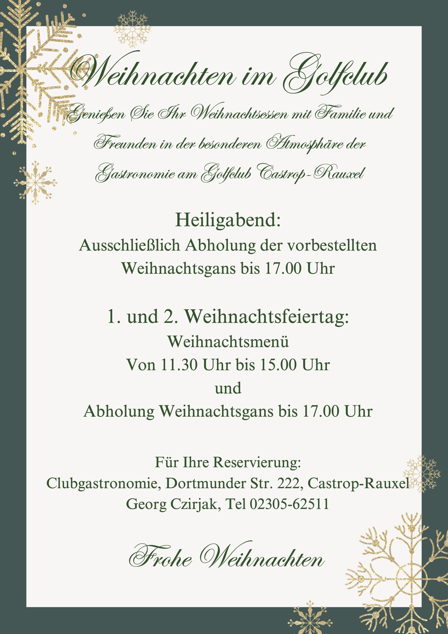 Charlotte Czirjak und ihr Team bieten in der Winterzeit und speziell zu Weihnachten zudem wieder einen besonders leckeren Service an: Wer will, kann die fantastische Gans aus der Clubgastronomie auch zu Hause genießen und das auch an Heiligabend und den beiden Weihnachtsfeiertagen. Dafür nimmt Charlotte Czrijak ab sofort Bestellungen entgegen. Achtung: Wer eine Gans für den heiligen Abend oder einen der beiden Weihnachtsfeiertage bestellt, muss diese dann in der Golfclubgastronomie in Castrop-Rauxel bis 17 Uhr abholen!